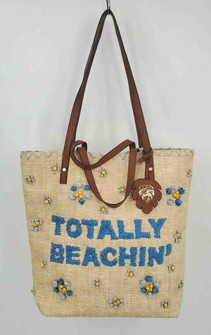 TOMMY BAHAMA Beige Blue Straw Word Print Tote Purse