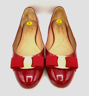 SALVATORE FERRAGAMO Red Goldtone Patent Leather Made in Italy Bow Flats Shoes