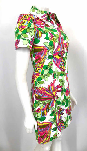 TRINA TURK Pink & Green White Multi Cotton Blend Butterflies Short Sleeves Dress