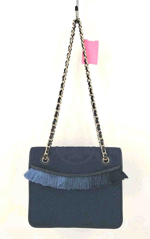 TORY BURCH Navy Goldtone Denim Chain Has Tag Fringe Crossbody Shoulder Bag Purse