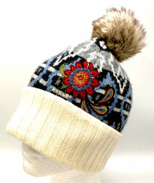 JOHNNY WAS White Burgundy Wool & Cashmere Blend Pre Loved Print Beanie Hat