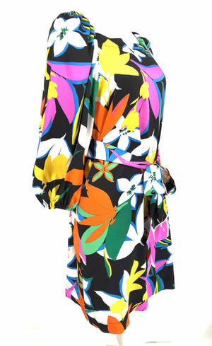 JOSEPH RIBKOFF Black & Blue Yellow Multi Floral Print Longsleeve Dress