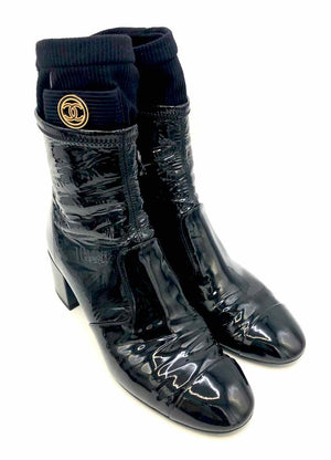 CHANEL Black Patent Leather Made in Italy Saddle 2.25" Chunky Heel Boots