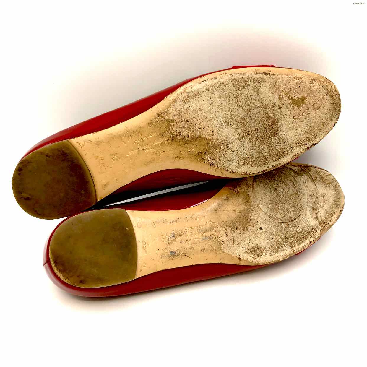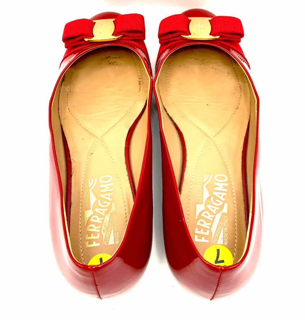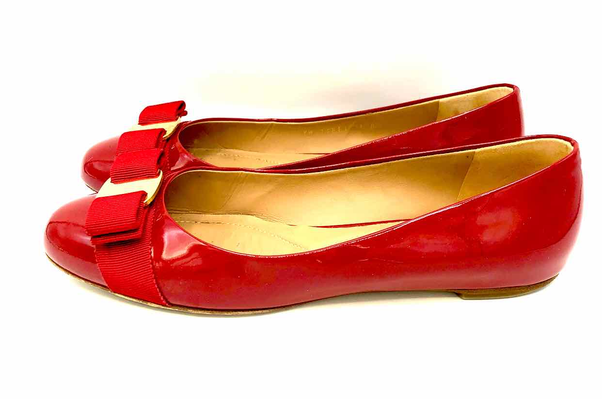 SALVATORE FERRAGAMO Red Goldtone Patent Leather Made in Italy Bow Flats Shoes